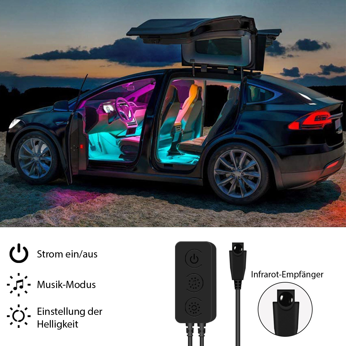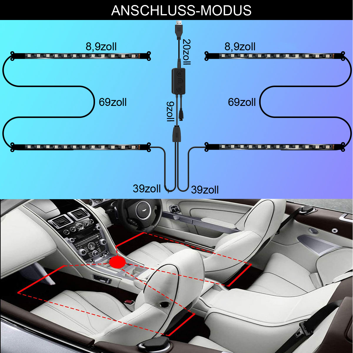 Längere Kabel passend für alle Automodelle. Die Rückseite des Streifens ist mit starkem 3M-Kleber beschichtet, zwei Linien sind mit vier Lichtstreifen verbunden, es ist nicht notwendig, die Lichtstreifen zu montieren, es ist einfacher zu installieren und zu verstecken, was eine schönere Optik ergibt, unsere Autoinnenbeleuchtung kann an jeden USB-Anschluss angeschlossen werden. Perfekt für alle Automodelle, TV, Computer, Heim- und Partydekoration.