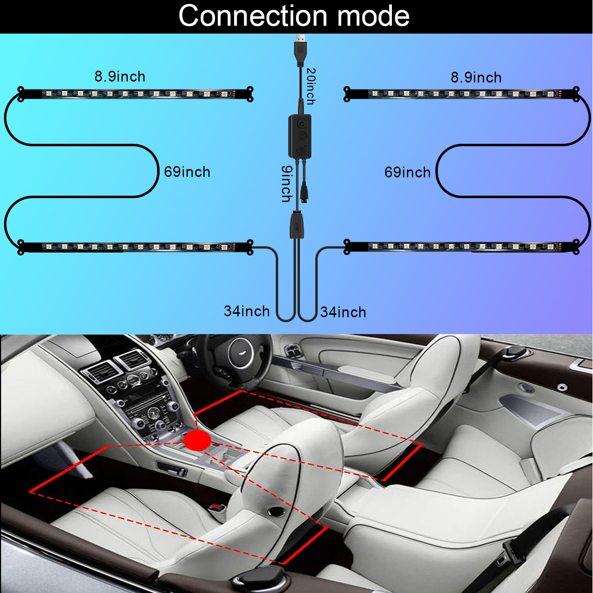 Longer cables suitable for all car models. The back of the strip is coated with strong 3M glue, two lines are connected with four light strips, no need to assemble the light strips, it is easier to install and hide, giving a neater visual, our car interior lights can be connected to any USB port. Perfect for all car models, TV, computer, home and party decoration.